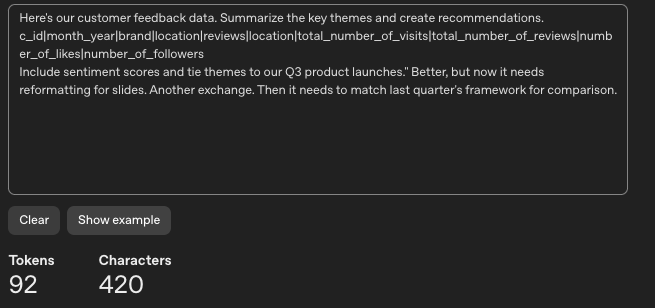 Your marketing team needs to analyze customer feedback from the past quarter and create a summary report. Someone asks GPT to do it: "Here's our customer feedback data. Summarize the key themes and create recommendations." Clean request. 50 tokens using OpenAI Tokenizer Counter.